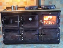 This option features 3 wood heated ovens, double hot plate, 2 extra electric ovens to boost the wood burning oven temperatures if needed, a grill in a top oven, and double domino hob – every option is covered to ensure ease of use and maximum cooking results, all at very low running costs. The wood burning main oven sits around 180-220C depending on your settings once fully running, the second top oven will run at between 20-30 degrees lower, and the lowest oven will again run 20-30 degrees lower all depending on how long the cooker has been alight. The electric ovens provide an extra boost in heat whenever needed, as the wood ovens will be providing a warm 60-80C to these ovens but electric control is there for when needed. It's also very useful to use only the electric source in the summer when you won't need your kitchen benefiting from the 3-5kW of wood burning heat.