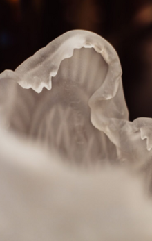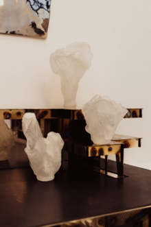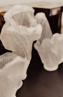 At Mint, her Neocrystals were on display, exploring memory and transformation through reclaimed lead glass crystal vessels, in which she 'talks to ghosts'. Inspired by damaged traditional crystal dishes she inherited from a close family member, the work reflects on grief, time and renewal, mixing her personal dialogue with traditional glassmaking.