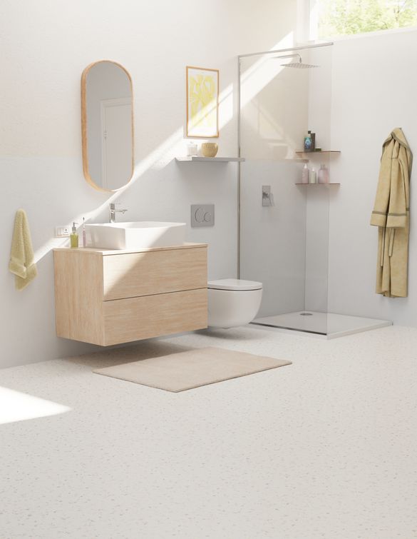 Bathrooms offer a prime opportunity to explore white’s refreshing character while steering clear of monotony. Here, subtle pattern and tone can be introduced through materials like terrazzo-style flooring in pale shades.