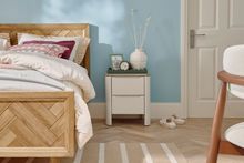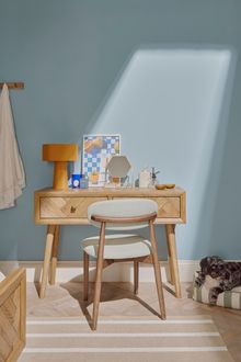 - The calm bedroom story combines natural oak furniture with a fresh sky blue canvas. The Parquet double bed and matching console table ground the space with warmth and distinctive grain.