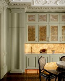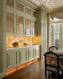 - A kitchen rich in detail in muted olive green offset with ceiling details that are highly patterned and detailed and nod to the era