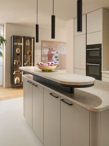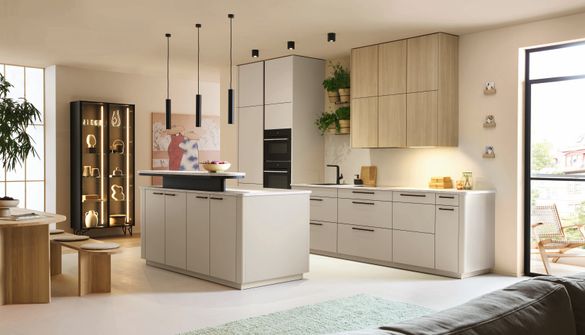 New additions include Sand grey matt fronts, sand oak synchronised pore-effect carcases, and travertine sand-effect worktops. Reflecting the kitchen's growing role as a social centre of the home, the 2026 collection introduces a rounded barboard that acts as a welcoming hub for cooking, dining and entertaining. Elegant new end panels, including quadrant and island formats, enhance the architectural language of the design, while curved support panel elements integrate seamlessly into adjoining living spaces.