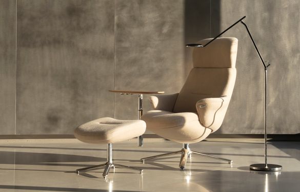 The Diffrient Lounge brings that idea to life nearly 20 years after the concept first emerged. Developed and refined by the Humanscale Design Studio, the chair adapts naturally to the user through an articulating back and headrest, intuitive adjustments, and a pivoting worksurface designed for laptops and devices.